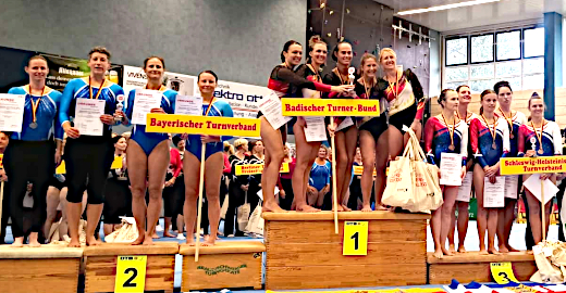 Mit über 3 Punkte Vorsprung verhinderten die Vierten des Vorjahres diesmal eine erfolgreiche Titelverteidigung und verwiesen Vorjahressieger Bayern auf Rang 2, obwohl in deren Team die Deutsche Seniorenmeisterin Desiree Girgenti mit 42,250 Punkten die beste Einzelwertung erzielte. Doch mit Platz 2 durch Maike Salewski-Krischok (41,450) und Katja Gerhardt (40,750) dahinter auf Rang 3 hielt das Team Mittelrhein erfolgreich dagegen und gewann!