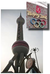 Der Oriental Pearl Tower - der dritthöchste TV-Turm der Welt; auch hier Olympia-Symbolik in Shanghai,
