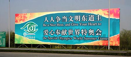 Schilder, die die Bevölkerung ermuntern, engagierte und freundliche Gastgeber zu sein und so harmonische Spiele zu gewährleisten, schmücken das Stadtbild.