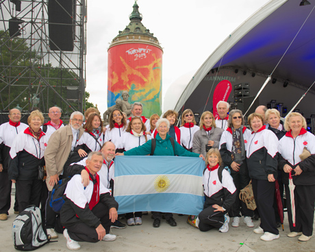 Johanna Quaas hinter der Flagge Argentiniens: ' Was habe ich mich gefreut, unsere argentinischen Freunde wiederzutreffen. Vor einigen Jahren hatte ich das Glück, mit einer hessischen Turntruppe mit dorthin zureisen - nun war das der Gegenbesuch!' |