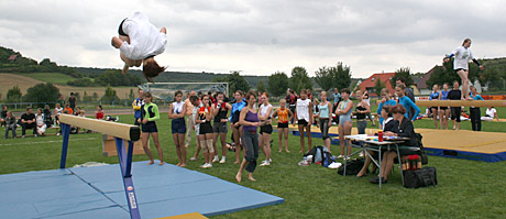 In Freyburg an der Unstrut, nahe Naumburg gehen Gerätturnerinnen und Gerätturner zwischen 14 und 90 Jahren unter freiem Himmel an die Geräte.
