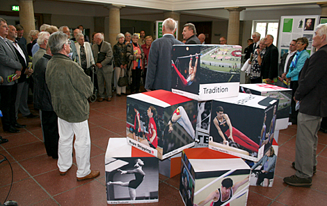Leipzigs neuer Turnpräsident Joachim Drischka (Foto, oben, Mitte,re.) und Organisator Uli Neubauer begrüßten die Gäste im Vestibül des Hallenkomplexes der ehemaligen Deutschen Hochschule für Körperkultur (DHfK) Leipzig, die heute der Sektion Sportwissenschaft der Uni sowie zahlreichen Vereinen Trainings- und Wettkampfmöglichkeiten bietet. Eine Ausstellung '150 Jahre Turnfesttradition in Leipzig' bildete den würdigen Rahmen.
