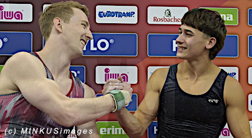 Sowohl Deutschlands junger Mehrkampfmeister Timo EDER (Foto oben, rechts; MTV Ludwigsburg: 80,664) wie auch sein acht Jahre ältere Routinier Nils DUNKEL (SV Chemie Halle: 80,364) übertrafen dabei mit ersten inhaltlichen Zuwächsen beide die 80'er Punktegrenze, auch mit einigen erkennbaren inhaltlichen Steigerungen: Eder an Ringen und Reck, Dunkel an Pferd und Barren. Allerdings traten insgesamt nur sechs deutsche Spitzenturner, in einem "Zwischenjahr" mit einer Einzel-WM in Jakarta (ohne Teamwertung), das Cheftrainer Jens Milbradt als "Lernjahr" bezeichnete und "von Bedacht" sprach, gefragt nach weiteren notwendigen, vor allem inhaltlichen Zuwächsen der Inhalte seines Spitzenkaders.