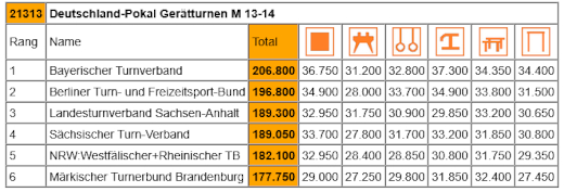 Nämlich mit exakt 10 Punkten Vorsprung siegten die BAYERN mit 206,800 Punkten vor dem Berliner Turn- und Freizeitsport-Bund (BTFB; 196,800) und setzten sich vor den Berlinern an 4 Top-Geräteergebnissen deutlich ab. Nur an den Ringen hielten die Hauptstädter dagegen - dort mit der höchsten Geräteleistung aller 6 Landesvertretungen.